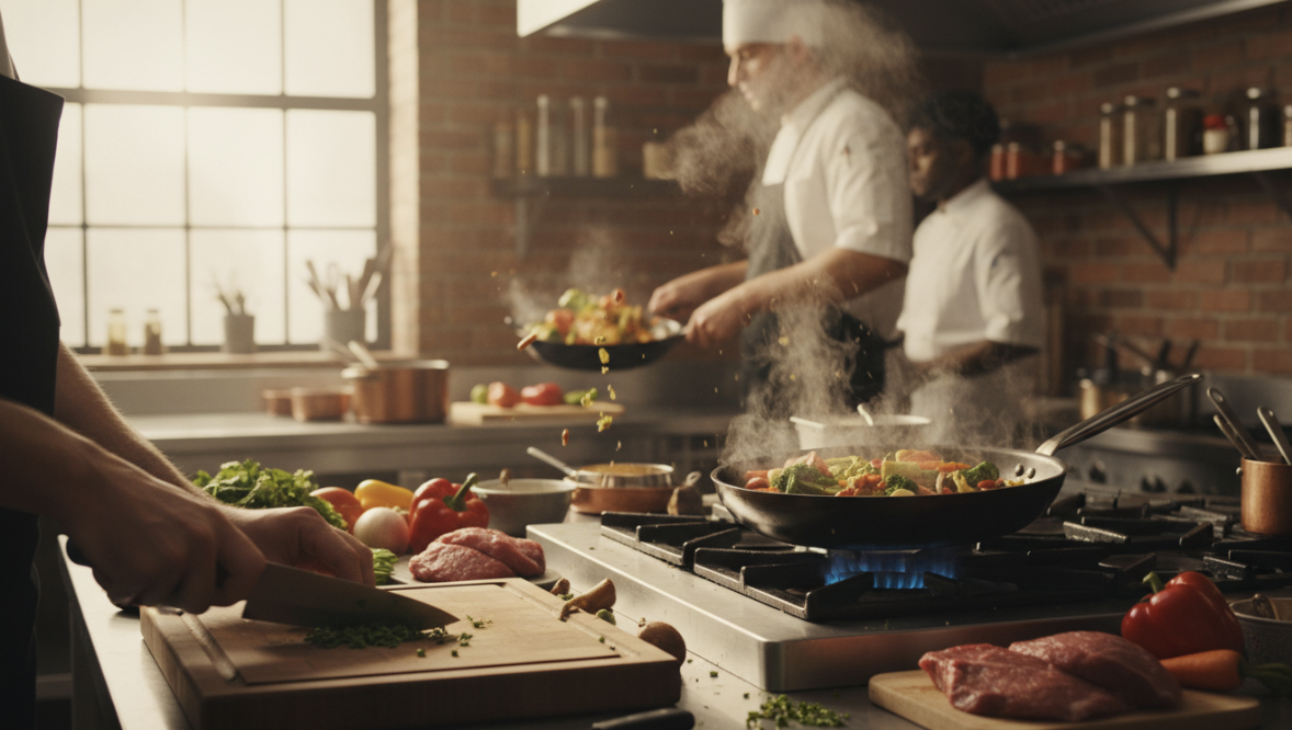 料理の調理過程を早送りで見せ、完成した料理の美しいビジュアルを提示します。