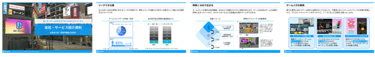 ゲーム内広告「Ad-Virtua(アドバーチャ)」とPRゲーム制作「ゲームバズ」について、特徴、届くユーザー層、導入事例、料金、配信の流れまでをまとめた広告主・代理店様向け資料です。